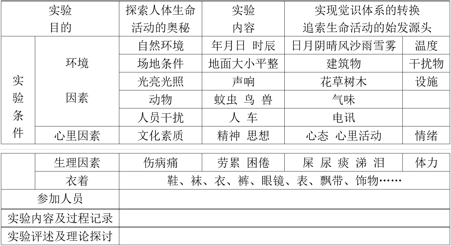 我們知道,人們的所有言行全都受控于人們的思想、情緒和意念。受思想、意念、情緒的支配、控制與指揮。然而,在這項實驗之中,思想、意念和情緒恰恰就成為了一種干擾。為了能夠得到原始、純真的自然信息,就必須完全、徹底、干凈地剔除思想、意念和情緒的控制、指揮。要確保作為觀測者的“我”能夠完全地集中、耦合到那個被觀察的對象上。而不是被其它的信號,諸如景物、聲響、情緒、思緒等等所吸引,所干擾。此外,來自身體內(nèi)、外的其它干擾還很多,在后面的表中有所羅列,需認(rèn)真、仔細(xì)地辨認(rèn)。通過認(rèn)真、細(xì)致的實際觀察,人們自然會有所收獲,有所成就。就其本質(zhì)而言,如何追尋到生命活動的始發(fā)之源頭,唯一的正確途徑只能是改造自己的生命活動狀態(tài),使之回歸到那個“使發(fā)之源”的狀態(tài)。所以實驗本身其實是一個對生命活動的自我改造過程,是對參與者自身生命活動的一種主動的自我改造。這種改造就展現(xiàn)為開發(fā)和挖掘出一個全新的、與常規(guī)的五官之覺不同的感覺體系。常規(guī)的五官之覺不外乎眼、耳、鼻、舌、身,得到的是信息,由之所升華的是理性的認(rèn)識與智慧;這種全新的感覺體系所接收的則是“作用”,由之所升華的只是對“作用”所發(fā)生的判斷和分辨能力的提升。生命活動的自我改造也只有在認(rèn)識這一客觀存在的同時得以成就。當(dāng)然,既然是“改造”,那也就意味著實驗的長期性和持久性。長期認(rèn)真地這樣做下去,日積月累,就能成就自己對這一客觀存在的識辨,發(fā)現(xiàn)并認(rèn)識其中的規(guī)律性。回歸到何時為止,其標(biāo)準(zhǔn)即回歸到“胎息”,即人在出生之前的狀態(tài)。在這種狀態(tài)之下,雖然有覺,卻不發(fā)生理智的控制作用。唯有以生命活動為特征的現(xiàn)象存在,無思、無念、無情、無智,此時的覺識中樞只有對“作用”與“信息”的純真記錄和反映。此時覺識本體所接收并發(fā)生分辨的,只是唯一自然的作用與信息,與社會因素?zé)o關(guān)。生命活動的狀態(tài)由自然作用的規(guī)律性所唯一確定,因而也只唯一反映自然作用的規(guī)律性。