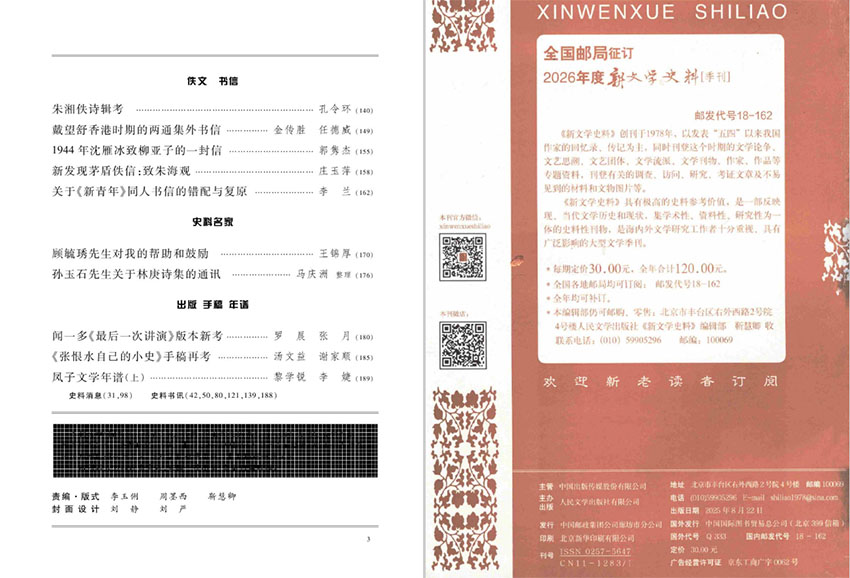 《新文學(xué)史料》雜志是由人民文學(xué)出版社主辦的大型文學(xué)史料類學(xué)術(shù)期刊,創(chuàng)刊于1978年。作為中國現(xiàn)當(dāng)代文學(xué)研究領(lǐng)域的重要刊物,它以“實事求是,恪守史德;百花齊放,百家爭鳴”為辦刊宗旨,致力于搜集、整理、考證和發(fā)表中國新文學(xué)運動以來的各類珍貴史料,在學(xué)界享有“新文學(xué)史料重鎮(zhèn)”的崇高聲譽。