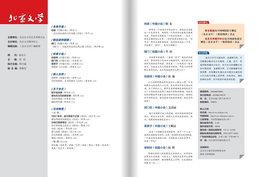 全年一共12期,月刊,單期208頁,彩色銅版紙。出版單位:北京文學(xué)月刊社